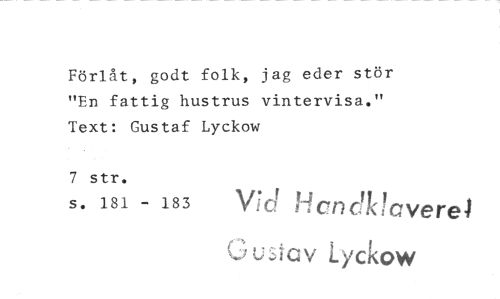//// Förlåt, godt folk, jag eder stör "En fattig hustrus vintervisa." Text: Gustaf Lyckow //// 7 str. //// s. 181 - 183 Vid Hencikicverel //// Ciu:Acw Lyckow ////