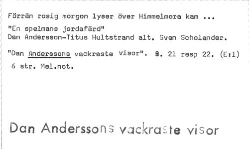 //// Förrän rosig morgon lyser över Himmelmora kam ... //// "En spelmans jordafärd" //// Dan Andersson-Titus Hultstrand alt. Sven Scholander. //// "Dan Anderssons vackraste visor". 8. 21 resp 22. (E:1) 6 str. Mel.not. //// Dan Anderssons vackra .te visor ////