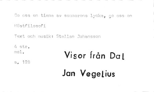//// Go oss en timma av sommarens lycka, ge oss en Höstfilosofi //// Text och musik: Stellan Johansson //// 4 str, //// mel. Visor från Da i //// s. 128 //// Jan Vegetius ////