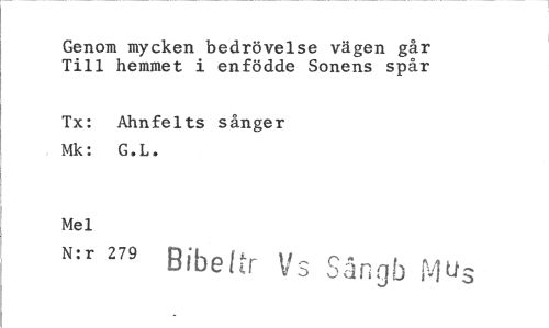 //// Genom mycken bedrövelse vägen går //// Till hemmet i enfödde Sonens spår //// Tx: Ahnfelts sånger Mk: G.L. //// Mel //// N:r 279 Bibeltr Vs Sångb Mus ////
