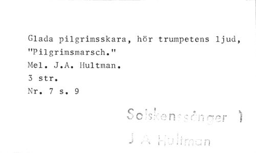 //// Glada pilgrimsskara, hör trumpetens ljud, "Pilgrimsmarsch." //// Mel. J.A. Hultman. //// 3 str. //// Nr. 7 s. 9 ////