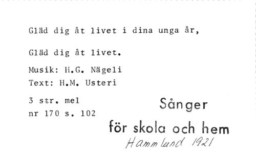 //// Gläd dig åt livet i dina unga år, Gläd dig åt livet. //// Musik: H.G. Nägeli Text: H.M. Usteri //// 3 str. mel Sånger //// nr 170 s. 102 för skola och hem //// No»,72 kAc( /9,(7 //// /