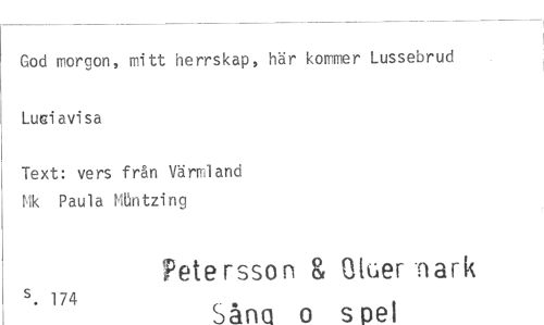 //// God morgon, mitt herrskap, här kommer Lussebrud //// Luaiavisa //// Text: vers från Värmland Nk Paula Möntzing //// Petersson & Ctuier -nark //// s. 174 Såna o spel ////