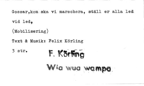 //// Gossar kom ska vi marschera, ställ er alla led vid led, //// (Mobilisering) //// Text & Musik: Felix Körling //// 3 str. F. KBrb //// W wuo wampo ////