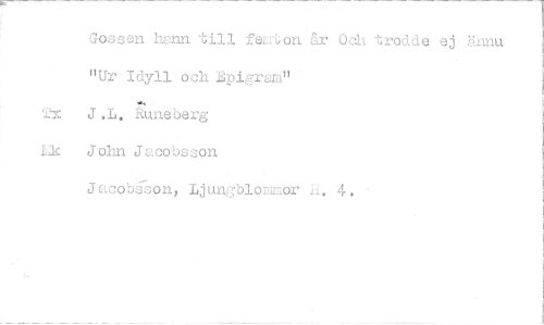 //// Gossen hann till feut;on år Och trodde ej ännu "Ur Idyll och 1,pigram" //// .1c J.L. Runeberg //// Ek John Jacobsson //// Jacobjson, Ljungblommor h. 4. ////