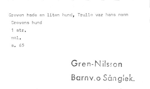 //// Greven hade en liten hunds Trulle var hans namn Grevens hund //// 1 str. //// mei. //// s. 65 //// Gren-Nilsson //// Barnv.o Sån grek. ////