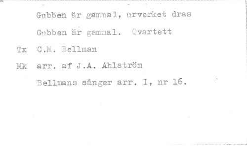 //// Gubben är gammal, urverket dras Gubben är gammal. 'svartett //// Tx C.M. Bellman //// Lik arr. af J.A. Åhlström //// Bellmans sånger arr. I, nr 16. ////