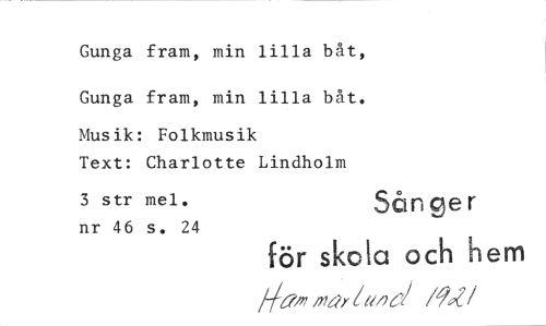 //// Gunga fram, min lilla båt, //// Gunga fram, min lilla båt. //// Musik: Folkmusik //// Text: Charlotte Lindholm //// 3 str mel. Sånger //// nr 46 s. 24 //// för skola och hem //// /-/am oaf /Im /W ////