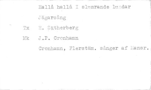//// Hallå hallå I slumrande lundar Jägarsång //// Tx H. Sätherberg Mk J.P. Cronhamn //// Cronhamn, Flerstäm. sånger af Lansr. ////