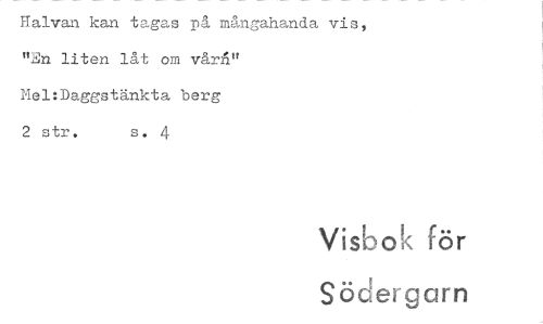 //// Halvan kan tagas på mångahanda vis, "En liten låt om vårt:" //// Mel:Daggstänkta berg //// 2 str. s. 4 //// Visbok för //// Södergarn ////