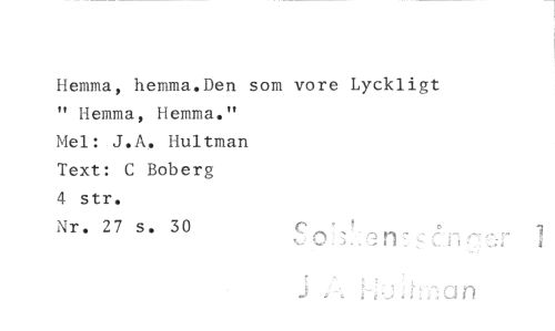 //// Hemma, hemma.Den som vore Lyckligt " Hemma, Hemma." //// Mel: J.A. Hultman //// Text: C Boberg //// 4 str. //// Nr. 27 s. 30 //// I I , ////