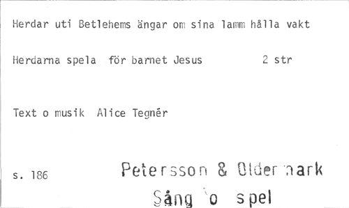 //// Herdar uti Betlehems ängar om sina lamm hålla vakt Herdarna spela för barnet Jesus 2 str //// Text o musik Alice Tegnér //// s. 186 Petersson g Ull er -.ud< //// 5ang .o spel ////