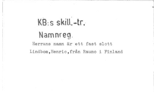 //// KB:s skilt.-tr. //// Namnreg. //// Herrans namn är ett fast slott Lindbom,Henric,från Raumo i Finland ////