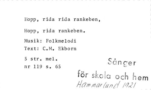 //// Hopp, rida rida rankeben, Hopp, rida rankeben. //// Musik: Folkmelodi //// Text: C.M. Ekborn //// 5 str. mel. nr 119 s. 65 5ånrer //// för skcia och hem //// Normaff11/2/-//v //// /