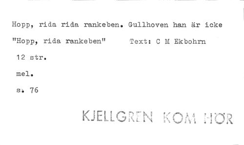 //// Hopp, rida rida rankeben. Gullhoven han är icke "Hopp, rida rankeben" Text: C M Ekbohrn //// 12 str. //// mel. //// s 76 //// K E ////