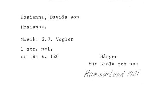 //// Hosianna, Davids son hosianna. //// Musik: G.J. Vogler //// 1 str. mel. //// nr 194 s. 120 Sånger //// för skola och hem //// #02/72af/u/2d lq2 //// /