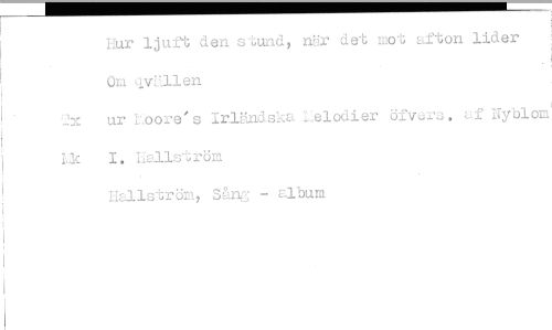 //// Hur ljuft den stund, när det mot afton lider Om qvällen //// 2x ur Loore's Irländska Lelodier öfvers. af Nyblom Lk 1. Hallström //// Hallström, Sång - album ////