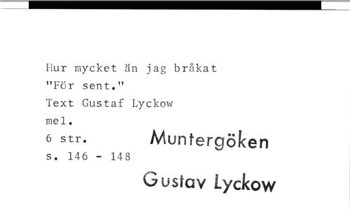 //// Hur mycket än jag bråkat "För sent." //// Text Gustaf Lyckow //// mel. //// 6 str. Muntergöken //// s. 146 - 148 //// Gustav Lyckow ////