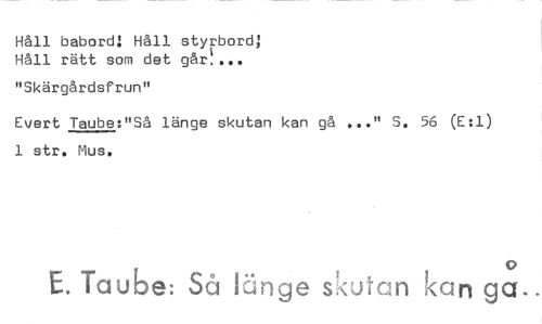 //// Håll babord! Håll styrbord; Håll rätt som det går!. //// "Skärgårdsfrun" //// Evert Taube:"Så länge skutan kan gå •.." S. 56 (E:1) 1 str. Mus. //// 0 //// E. Taube: Så länge skutan kan gå.. ////