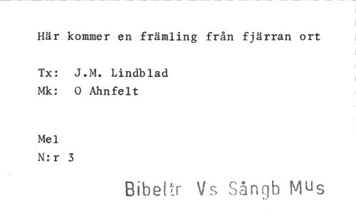 //// Här kommer en främling från fjärran ort //// Tx: J.M. Lindblad Mk: 0 Ahnfelt //// Mel N:r 3 //// Bibeltr ids Sångb Mus ////