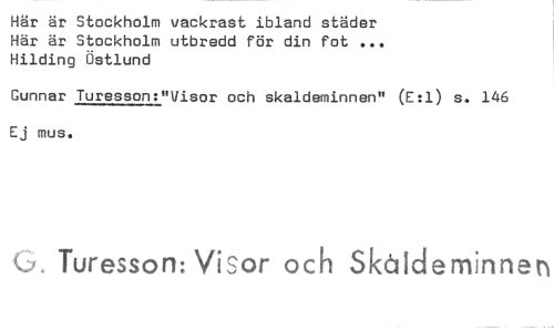 //// Här är Stockholm vackrast ibland städer Här är Stockholm utbredd för din fot ... Hilding Östlund //// Gunnar Turesson:"Visor och skaldeminnen" (E:1) s. 146 Ej mus. //// Turesson: Visor och Sktddeminneri ////