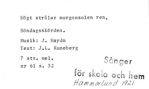 //// Högt strålar morgonsolen ren, Söndagsskörden. //// Musik: J. Haydn Text: J.L. Runeberg //// 7 str. mel. „..:naer //// nr 61 s. 32 för skola och hem //// liam /nar/al) d /921 ////