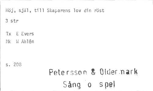 //// Höj, själ, till Skaparens lov din röst 3 str //// Tx E Evers //// Mk Åhlén //// s. 208 //// Petersson te Olcier.narls //// Sång 9 s QI ////