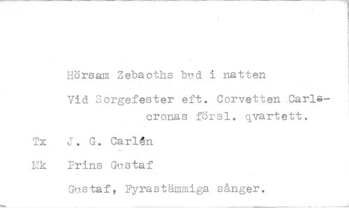 //// Hörsam Zebaoths brd i natten //// Vid Sorgefester eft. Corvetten Carlgcronas försl. qvartett. //// Tx J. G. Carldn Mk Prins Gustaf //// Gustaf, Fyrastämmiga sånger. ////