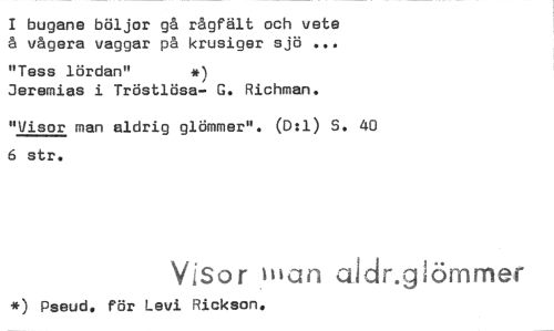 //// 1 bugane böljor gå rågfält och vete å vågors vaggar på krusiges sjö //// "Tass lördan" *) //// Jeremias i Tröstlösa- G. Richman. //// "Visor man aldrig glömmer". (D:1) 9. 40 6 str. //// Visor wan clidngiörniller //// *) Pseud. för Levi Rickson. ////