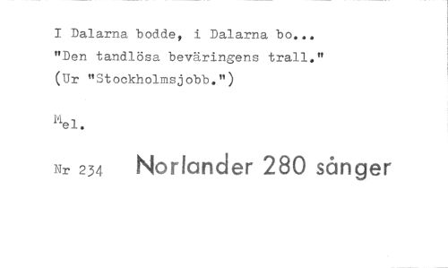 //// I Dalarna bodde, i Dalarna bo... "Den tandlösa beväringens trall." (Ur "Stockholmsjobb.") //// Mel. //// Nr 234 Norlander 280 sånger ////
