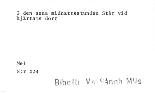 //// I den sena midnattsstunden Står vid hjärtats dörr //// Mel //// N:r 424 //// Bibeltr c, gAnnh Mus ////