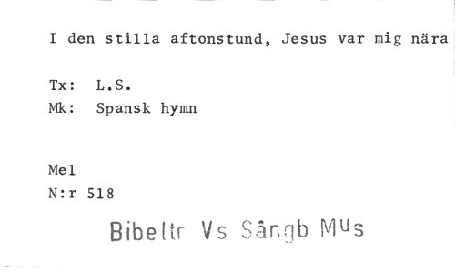 //// I den stilla aftonstund, Jesus var mig nära //// Tx: L.S. //// Mk: Spansk hymn //// Mel //// N:r 518 //// Bibettr Vs Sår-rjb Mus ////