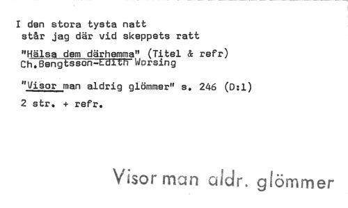 //// I den stora tysta natt //// står jag där vid skeppets ratt //// "Hälsa dem därhemma" (Titel & refr) Ch.Bengtsson—tditn Worsing //// "Visor man aldrig glömmer" s. 246 (D:1) 2 str, refr. //// Visor mun aldr. glömmer ////