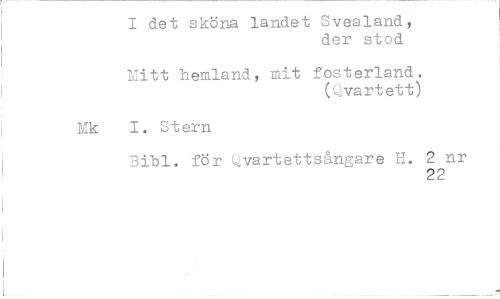 //// I det sköna landet Svealand, //// der stod //// Mitt hemland, mit fosterland. //// (Qvartett) //// Mk I. Stern //// Bibi. för Qvartettsångare H. 2 nr //// 22 ////