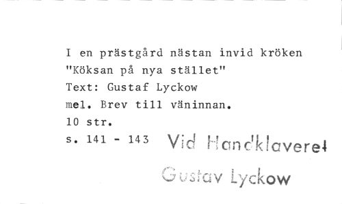 //// I en prästgård nästan invid kröken "Köksan på nya stället" //// Text: Gustaf Lyckow //// mel. Brev till väninnan. //// 10 str. //// s. 141 - 143 Vid Hendidavere4 //// f.av Lyckow ////