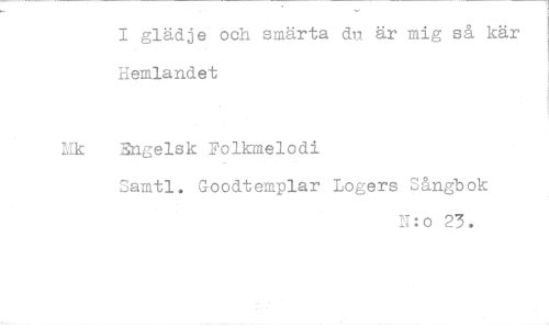 //// I glädje och smärta du är mig så kär--1 Hemlandet //// Lik Engelsk Folkmelodi //// Samtl. Goodtemplar Logers Sångbok //// N:o 23. ////