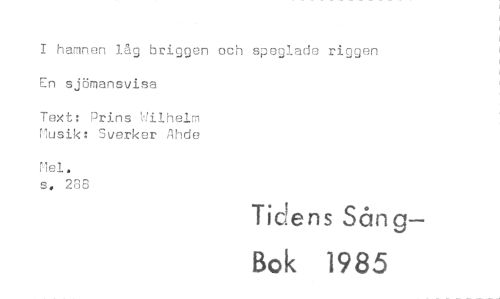 //// I hamnen låg briggen och speglade riggen En sjömansvisa //// Text: Prins Wilhelm //// Musik: Sverker Ahde //// Mel. //// s, 288 //// Tidens Sång— //// Bok 1985 ////