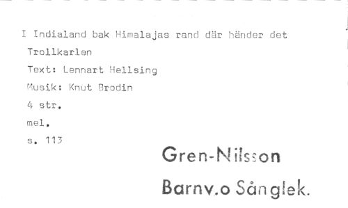 //// I Indialand bak Himalajas rand där händer det Trollkarlen //// Text: Lennart Hellsing //// Musik: Knut Brodin //// 4 str. //// mel. //// s. 113 //// Gren-Nitson //// Bormo Sån g e . ////