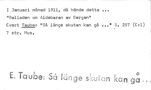 //// I Januari månad 1911, då hände detta //// "Balladen om Aldebaran av Bergen" //// Evert Taube: "Så länge skutan kan gå ..." S. 287 (E:1) //// 7 str, Mus. //// 0 //// E. Taube: Så länge skutan kan ga ////
