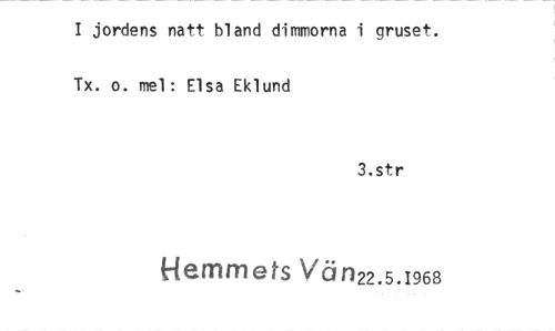 //// I jordens natt bland dimmorna i gruset. Tx. o. mel: Elsa Eklund //// 3.str //// Hemmets VÖn22.5.I968 ////