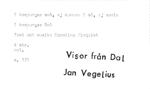//// I korpungar små, ej kunnen I så, ej samla I korpungar Små //// Text och musik: Carolina Almquist //// 4 str. mel. Visor från Dal //// s. 131 Jan Vegelius ////