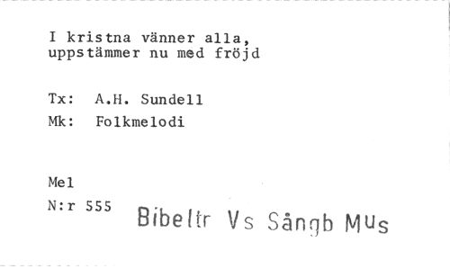 //// I kristna vänner alla, uppstämmer nu med fröjd //// Tx: A.H. Sundell Mk: Folkmelodi //// Mel //// N:r 555 Bibeltr Vs Särmb Mus ////