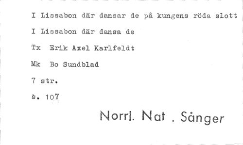//// Lissabon där dansar de på kungens röda slott I Lissabon där danaa de //// Tx Erik Axel Karlfeldt Mk Bo Sundblad //// 7 str. //// å. 101, //// Nord. Ned . Sånger ////