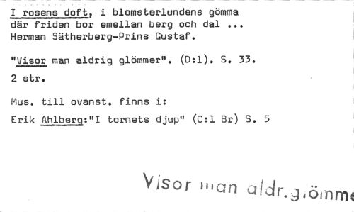 //// I rosens doft, i blomsterlundens gömma där friden bor emellan berg och dal ... Herman Sätherberg-Prins Gustaf. //// "Visor man aldrig glömmer". (0:1). S. 33. 2 str. //// Mus. till ovanst. finns i: //// Erik Ahlbero:"I tornets djup" (C:1 Br) S. 5 //// Visor man aldr.j ÖtTlffit ////