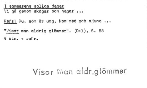 //// 1 sommarens soliga dagar //// Vi gå genom skogar och hagar ... //// Refr: Du, som är ung, kom med och sjung "Visor man aldrig glömmer". (0:1). S. 88 4 str. refr. //// Visor ill an r Iömmer ////