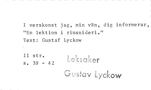 //// I verskonst jag, min vän, dig informerar, "En lektion i rimsnideri." //// Text: Gustaf Lyckow //// 11 str. aker //// s. 39 - 42 //// ustav zow ////