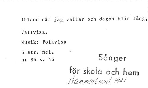 //// Ibland när jag vallar och dagen blir lång, //// Vallvisa. //// Musik: Folkvisa //// 3 str. mel. Sånger //// nr 85 s. 45 för skela och hem //// klam M&/Z typd /v //// /