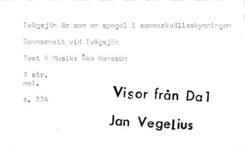 //// Ivägsjön är som en spegel i sommarkvällsskymningen Sommarnatt vid Ivägsjön //// Text & Musik: Åke Hansson //// 3 str. mel. //// s. 234 Visor från Da I //// Jan Vegelius ////