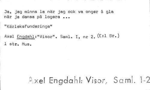 //// Ja, jag minns la när jag ock va anger å gla när ja dansa på logera //// "Kärleksfunderinga" //// Axel Engdahl:"Visor". Saml. I, nr 2. (E:1 Br.) 1 str. Mus. //// xel Vi3or Semi. 1-2 ////