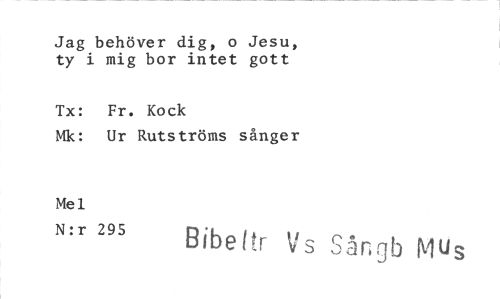 //// Jag behöver dig, o Jesu, ty i mig bor intet gott //// Tx: Fr. Kock //// Mk: Ur Rutströms sånger //// Mel //// N:r 295 Bibeftr Vs Sångb Mus ////